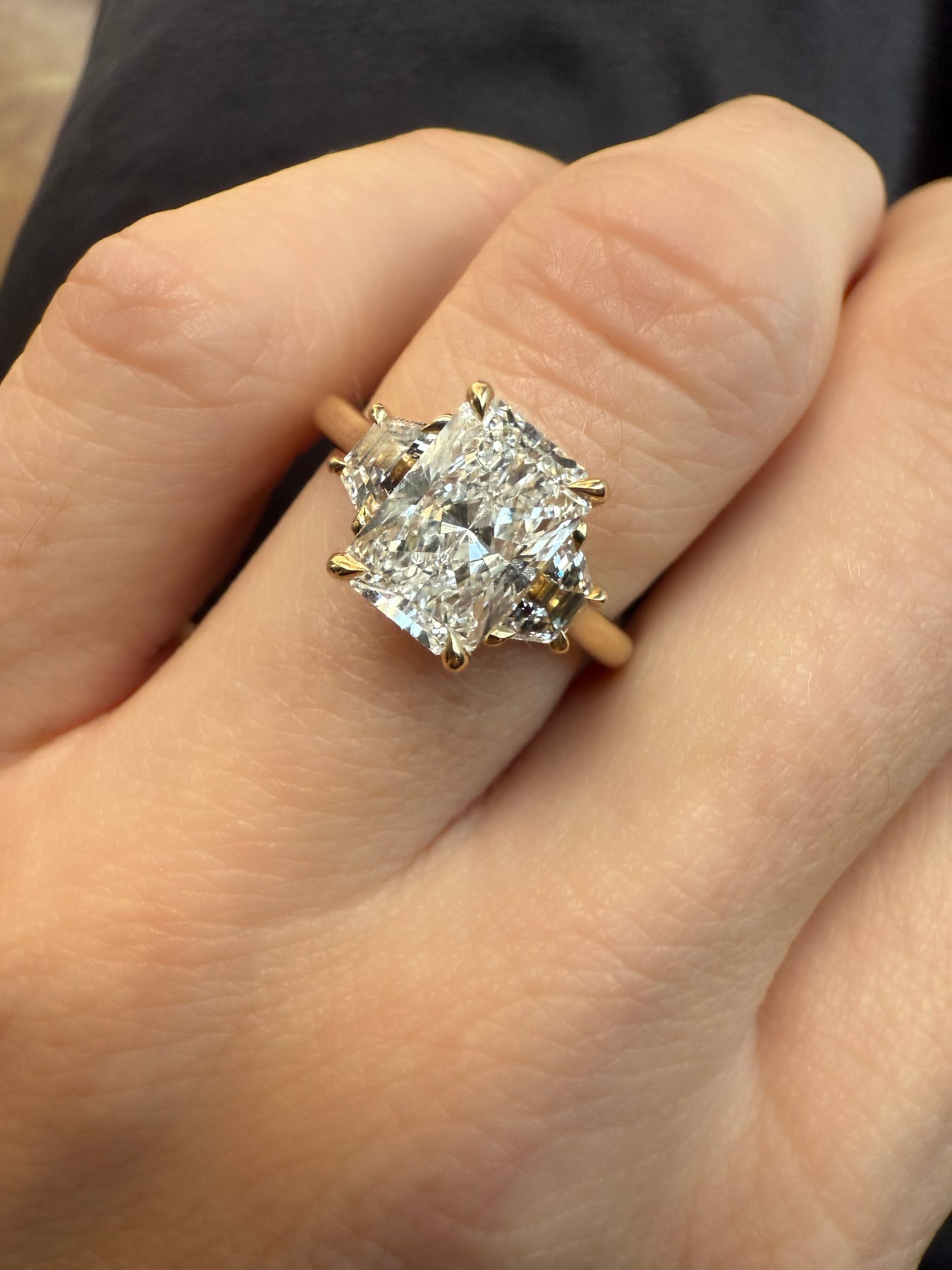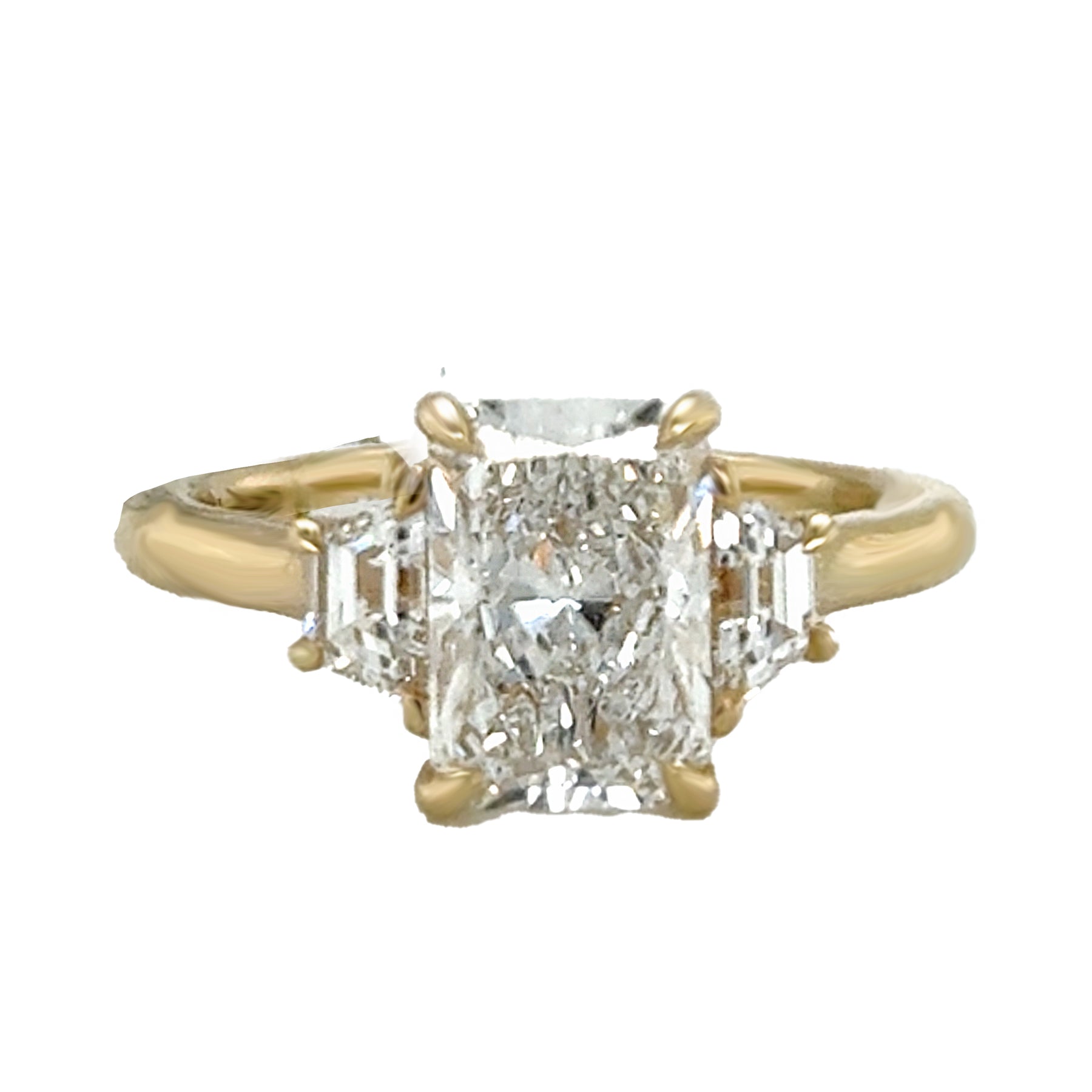 This classic three-stone ring features a delicate hidden halo and two matching trapezoid cut side stones to compliment the radiant-cut center stone. An elegant design that can one day become an heirloom piece to pass down for generations. As with all JBJ Collection rings, this ring is built up to stack a band that is approximately 2mm in thickness.