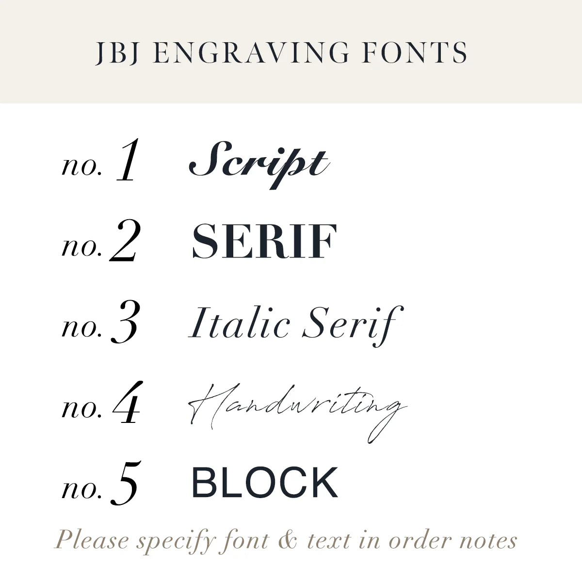 If adding engraving, please specify font & text in the "special instruction" notes - Message us to learn more about engraving options! Custom fonts available