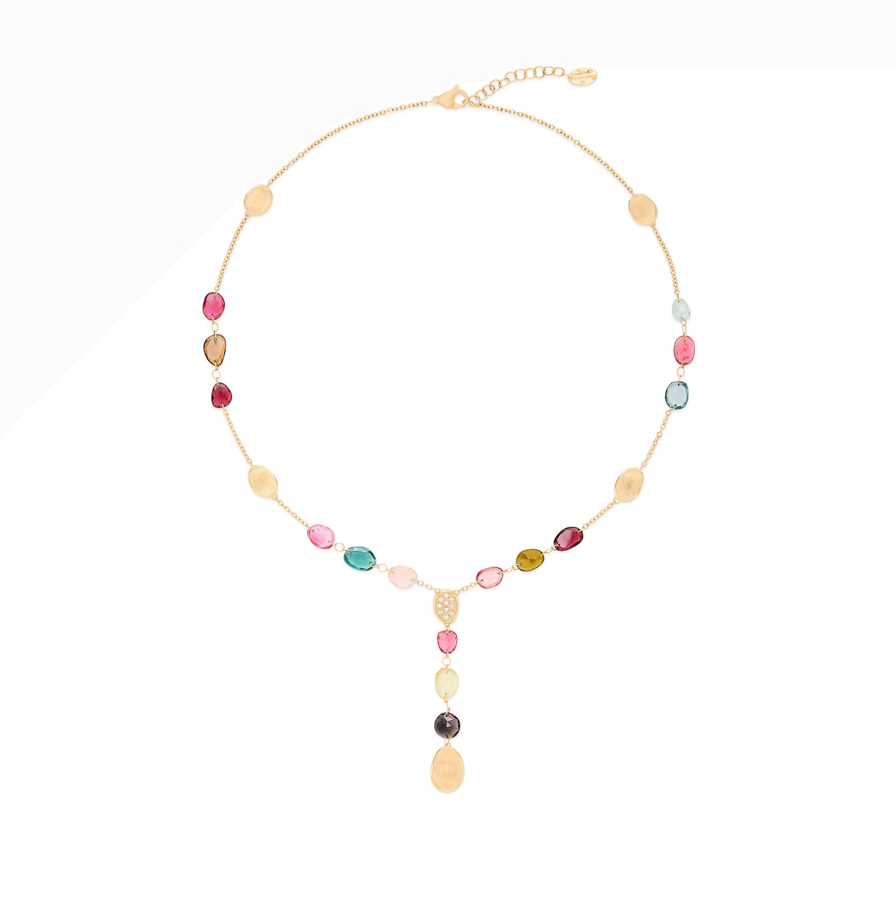An elegant 18K yellow gold lariat necklace, adorned with gold leaves delicately hand-engraved using the ancient Florentine technique, alternating with vibrant tourmalines. This necklace features an adjustable chain, offering a customizable fit for every neckline. The perfect jewel to infuse any ensemble with a sophisticated touch of color.