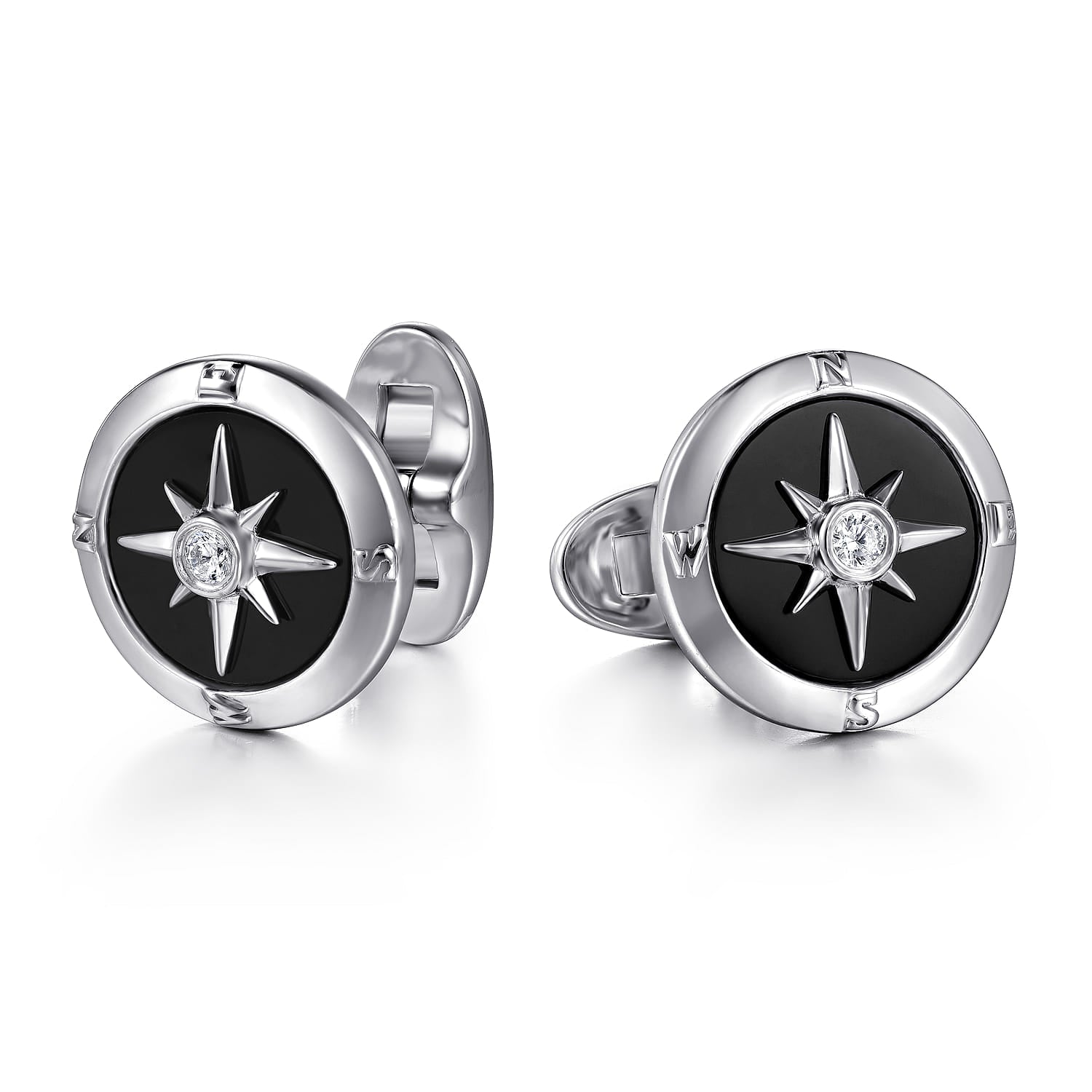 These round sterling silver cufflinks feature a striking compass-inspired design, centered by a single diamond accent that catches the light with quiet authority. Deep black onyx inlays bring contrast and character, while the High Polished finish adds subtle texture to the polished silhouette.
