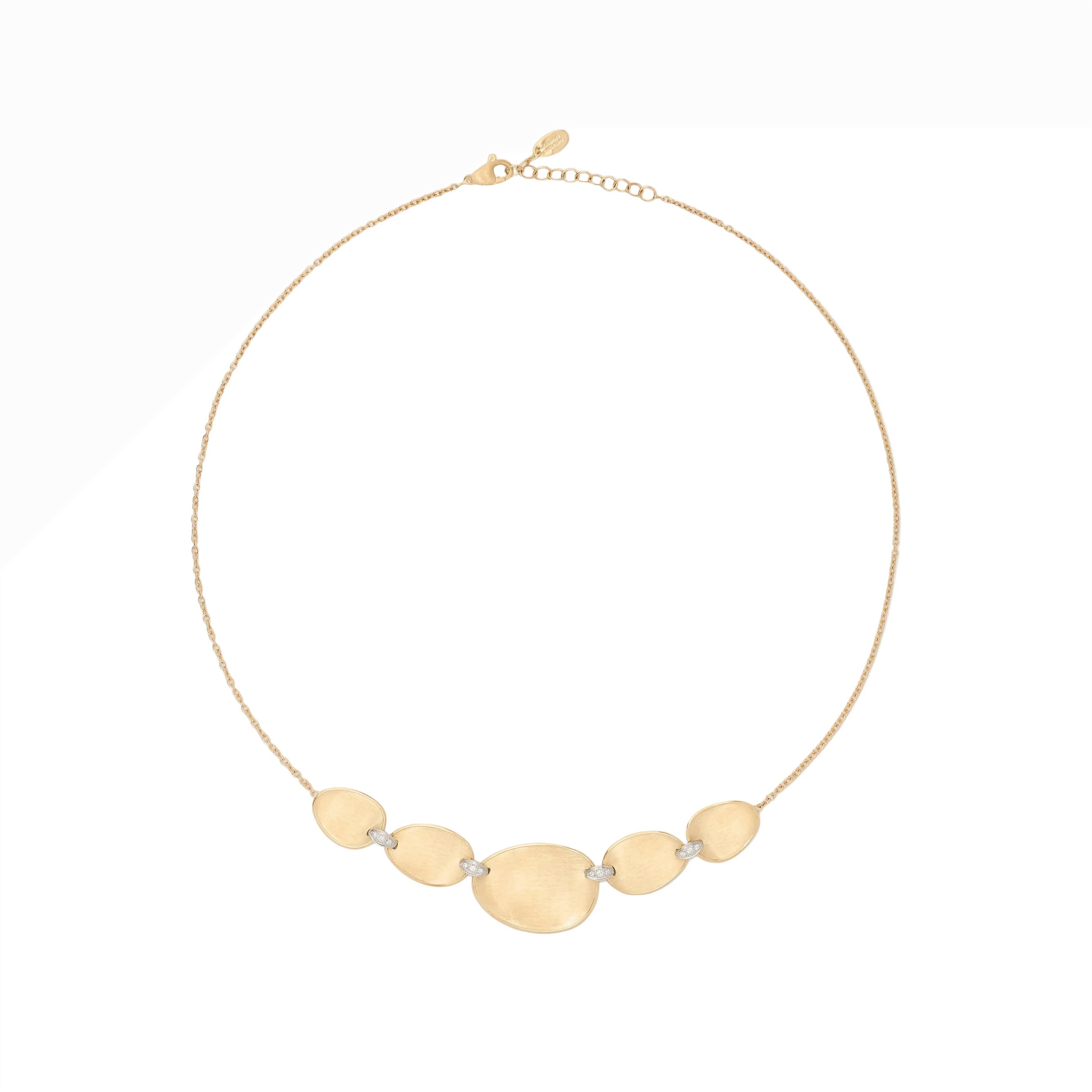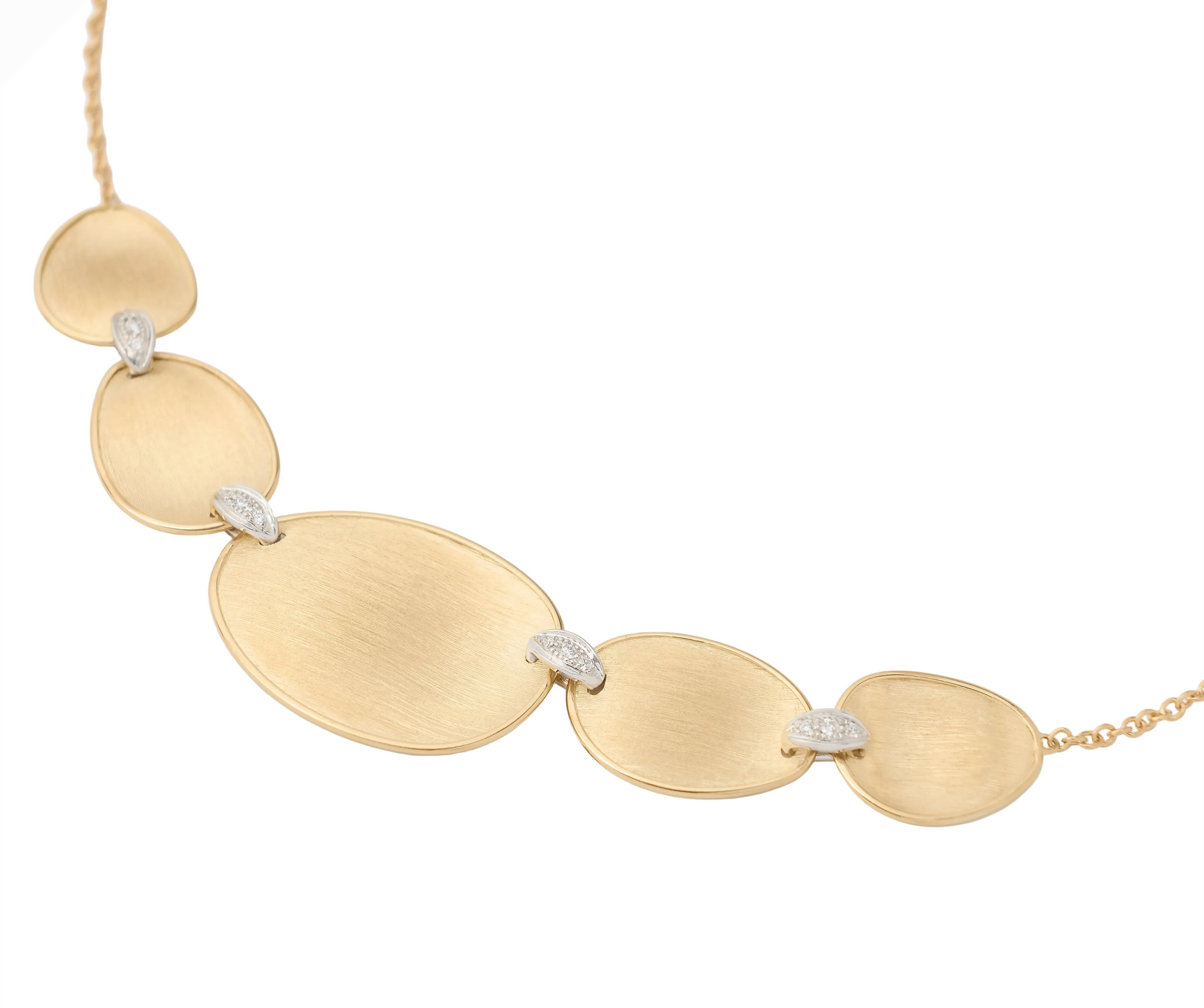 Regular price $5,700.00 Save 0%Handcrafted in Italy, this long necklace features a graceful sequence of 18K yellow gold leaves, each finely hand-engraved using the traditional Florentine “bulino” technique. Delicate pavé diamond links connect each sculptural element, creating a fluid rhythm of brilliance and light. Suspended from a slender, adjustable chain, this piece offers a customizable fit—designed to layer effortlessly across necklines and seasons.