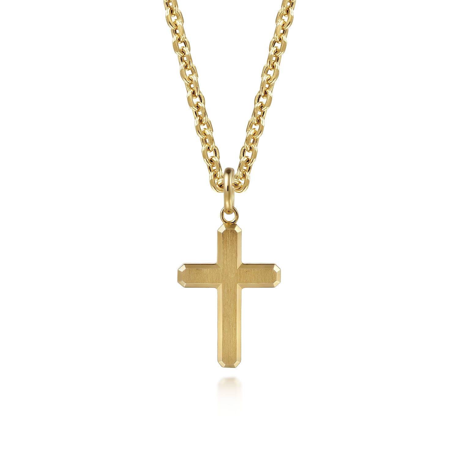Beveled and faceted edges define this geometric cross pendant, creating subtle shifts in light across its surface. The satin finish lends a smooth, modern character to the design.